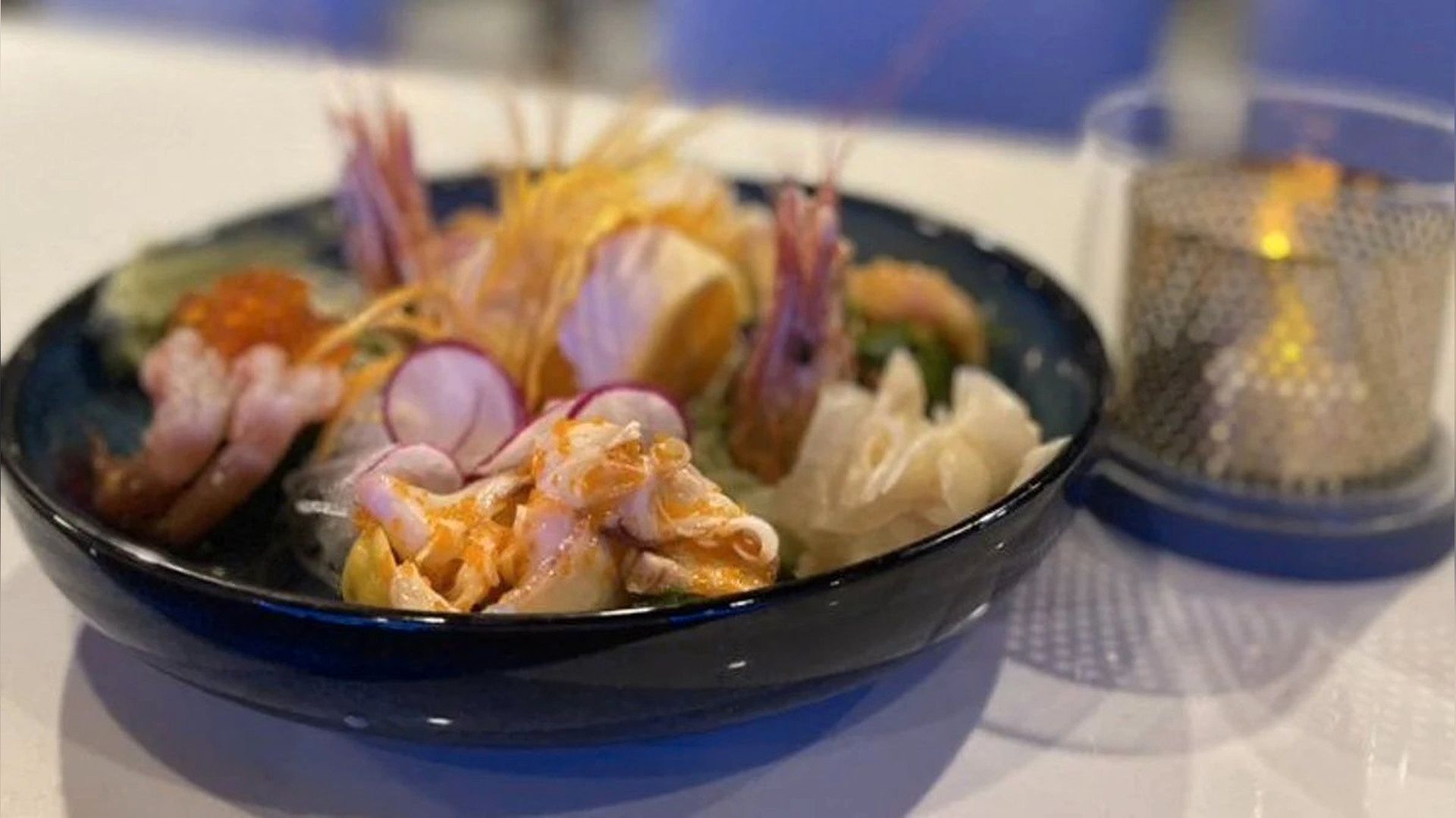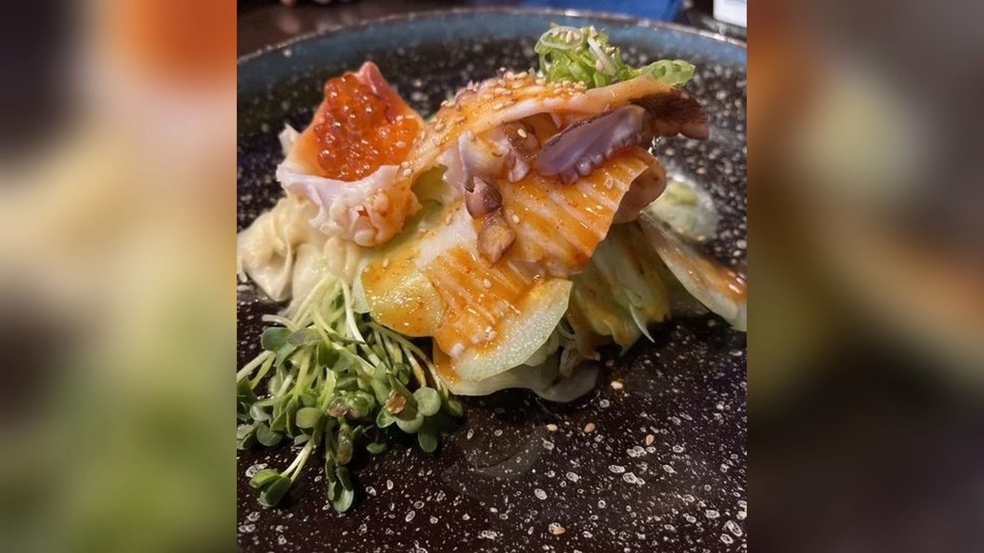 Sliced conch & octopus, sliced cucumber, garnished with Kani stick and Ebi, with spicy ponzu sauce