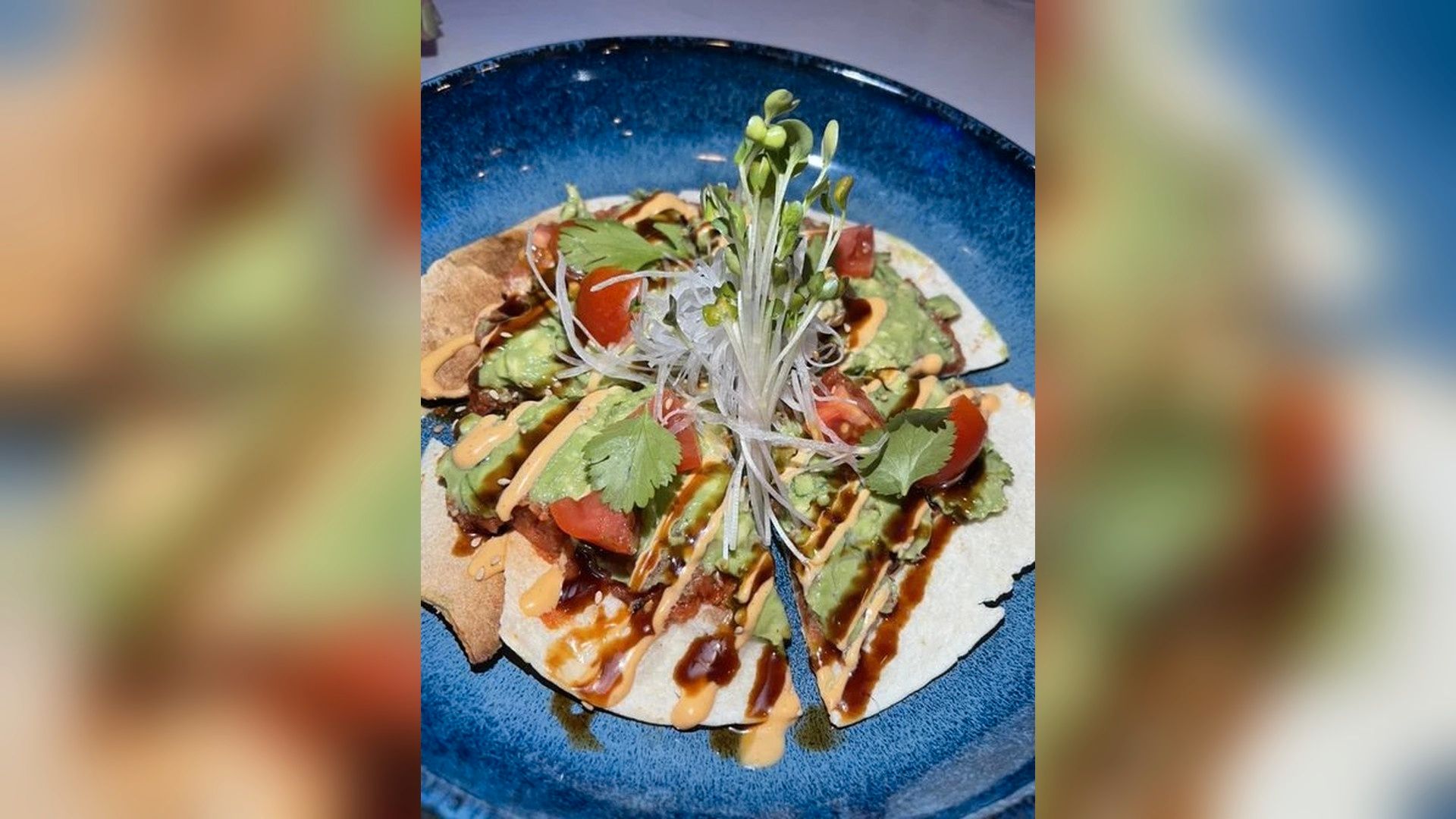 Spicy tuna, Avocado, cherry tomatoes, onions & cilantro on a bed of baked tortilla, topped with wasabi mayo & eel sauce